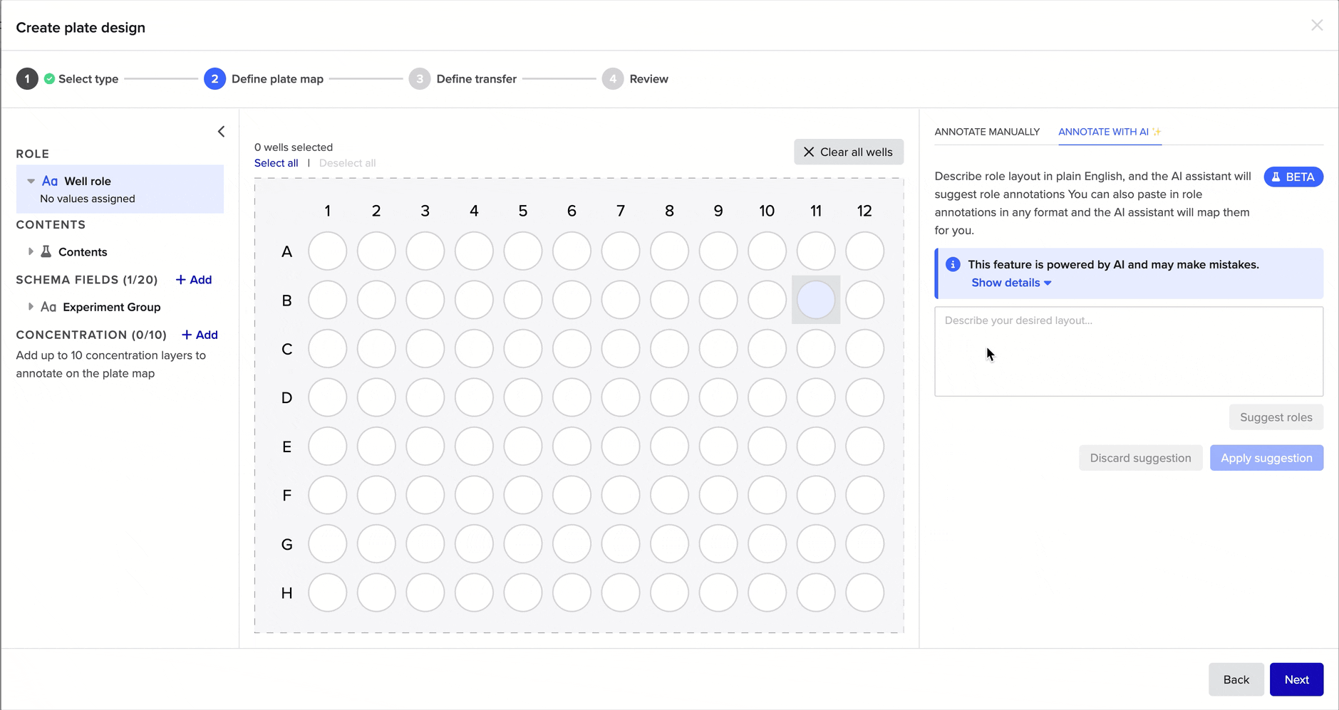 Plate maps provide scientists with easier ways to capture data and draw insights from plate-based experiments. The interactive interface allows users to visually annotate wells with experimental metadata, and fill plates with contents tracked in Benchling. This release helps scientists by:
